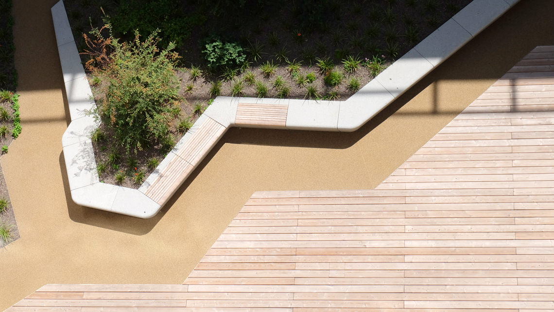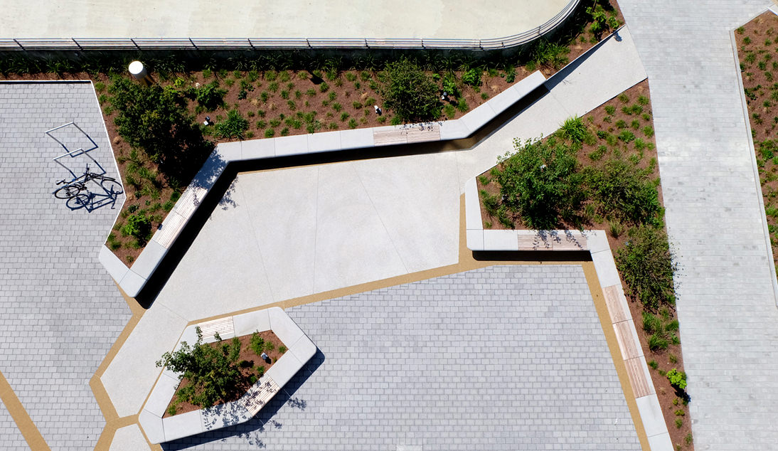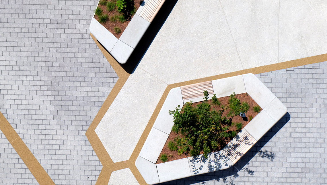 Die Außenanlagen des Verwaltungsneubaus teilen sich in verschiedene Bereiche auf, deren Gestaltungsintensität und Ausprägung auf unterschiedliche Ansprüche reagieren muss. Die Zonen sind Innenhof des SkyPort, Eingangsbereich und Meetingpoint.