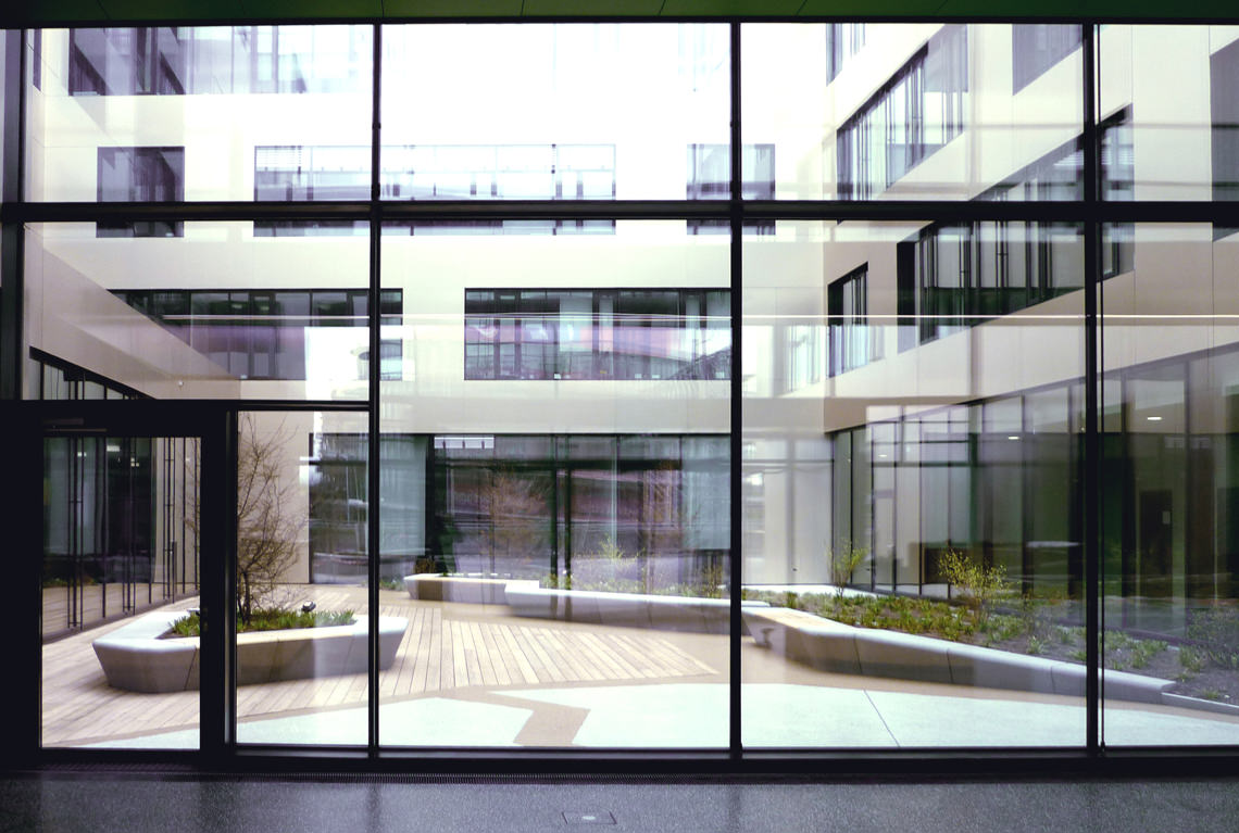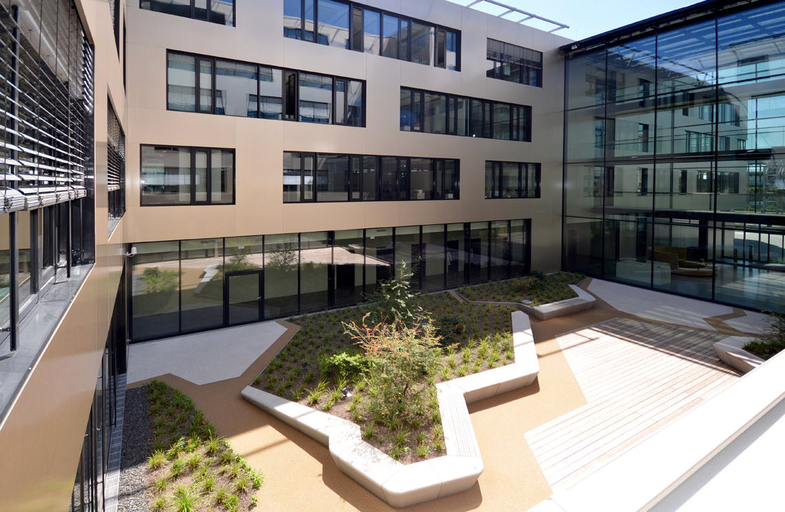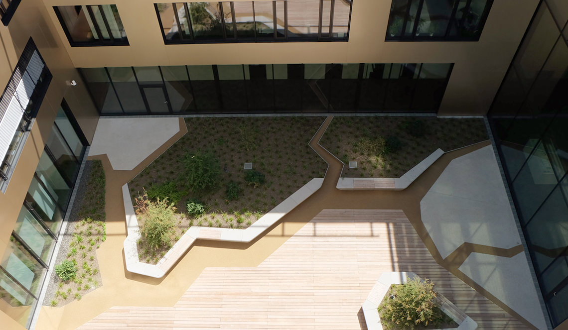 Das Innere des Gebäudes öffnet sich zum Innenhof, der als Herzstück neben seiner repräsentativen Funktion auch als Rückzugsraum und Rohezone oder Veranstaltungsfläche dienen soll. Das Thema „Grün“ als psychologisch und gestalterisch wertvoller Ansatz, spielt inmitten der Flughafenlandschaft eine wichtige Rolle. Der Innenhof als eigenes System im Zentrum des neuen Verwaltungsgebäudes soll Ruhe ausstrahlen und durch sein Erscheinungsbild positive Assoziationen wecken. Die Pflanzenauswahl orientiert sich an einem "Extremstandort", in den schattentoleranten Gräserflächen finden sich Tuffs aus Farnen und Flechten. Wuchsform, Blatt- und Rindenschmuck der Bäume unterstreichen das Thema.