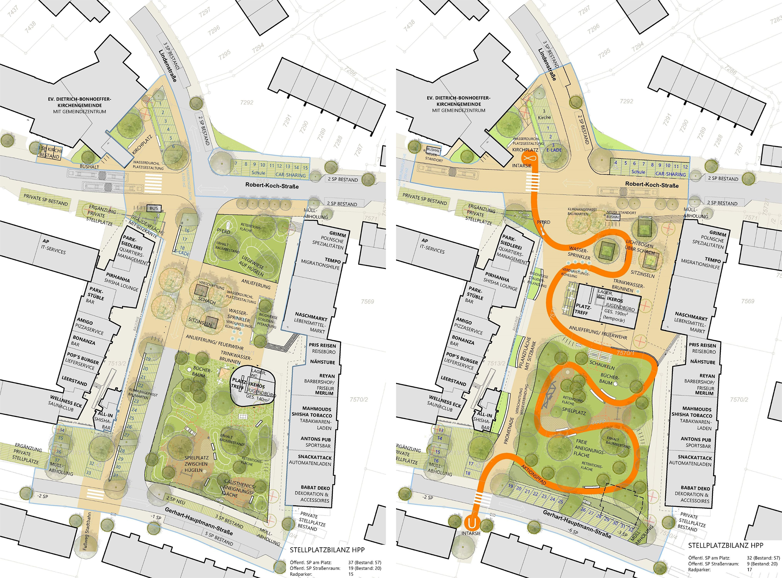 In Variante 2 ist der Herzog-Philipp-Platz frei vom Autoverkehr. Die Parkierung befindet sich am Platzrand, entlang der Robert-Koch-Straße und der Gerhart-Hauptmann-Straße. In dieser Variante ist ein größerer befestigter Platz zur Robert-Koch-Straße hin angelegt. Hier könnten Sitzinseln mit Bäumen, Wasserspiel, Großschach und ein Pavillon als Platztreff eingerichtet werden. Daran schließt bis zur Gerhart-Hauptmann-Straße eine große Grünfläche an. Diese Grünfläche kann einen Spielplatz, Aktionsflächen und Sitzmöglichkeiten enthalten. In Varinate 2 ist zudem ein Aktionspfad dargestellt, der sich von der Stadtbahn kommend bis zum Kirchenvorplatz schlängelt und an vielen Gestaltungs- und Erlebniselementen vorbei führt.