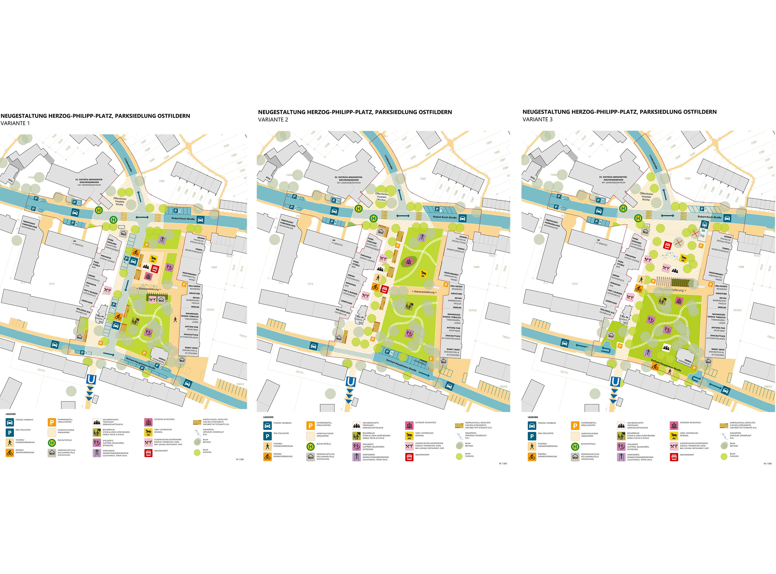 In Variante 1 führt über den Herzog-Philipp-Platz eine Einbahnstraße in Nord-Süd-Richtung und erschließt damit eine Parkierungszeile. Der östliche Platzbereich könnte als grüne Hügellandschaft angelegt werden, der mittig von einer kleineren befestigten Platzfläche unterbrochen wird. Wasserspiel, Großschach und Baumbeete lassen sich integrieren. In der südlichen Grünfläche zur Gerhart-Hauptmann-Straße lassen sich weitere Erlebnis- und Ausstattungsinhalte anlegen. Dies reicht vom Pavillon als Platztreff über einen Spielplatz bis zu kleineren Aktionsflächen für Spiel und Sport.