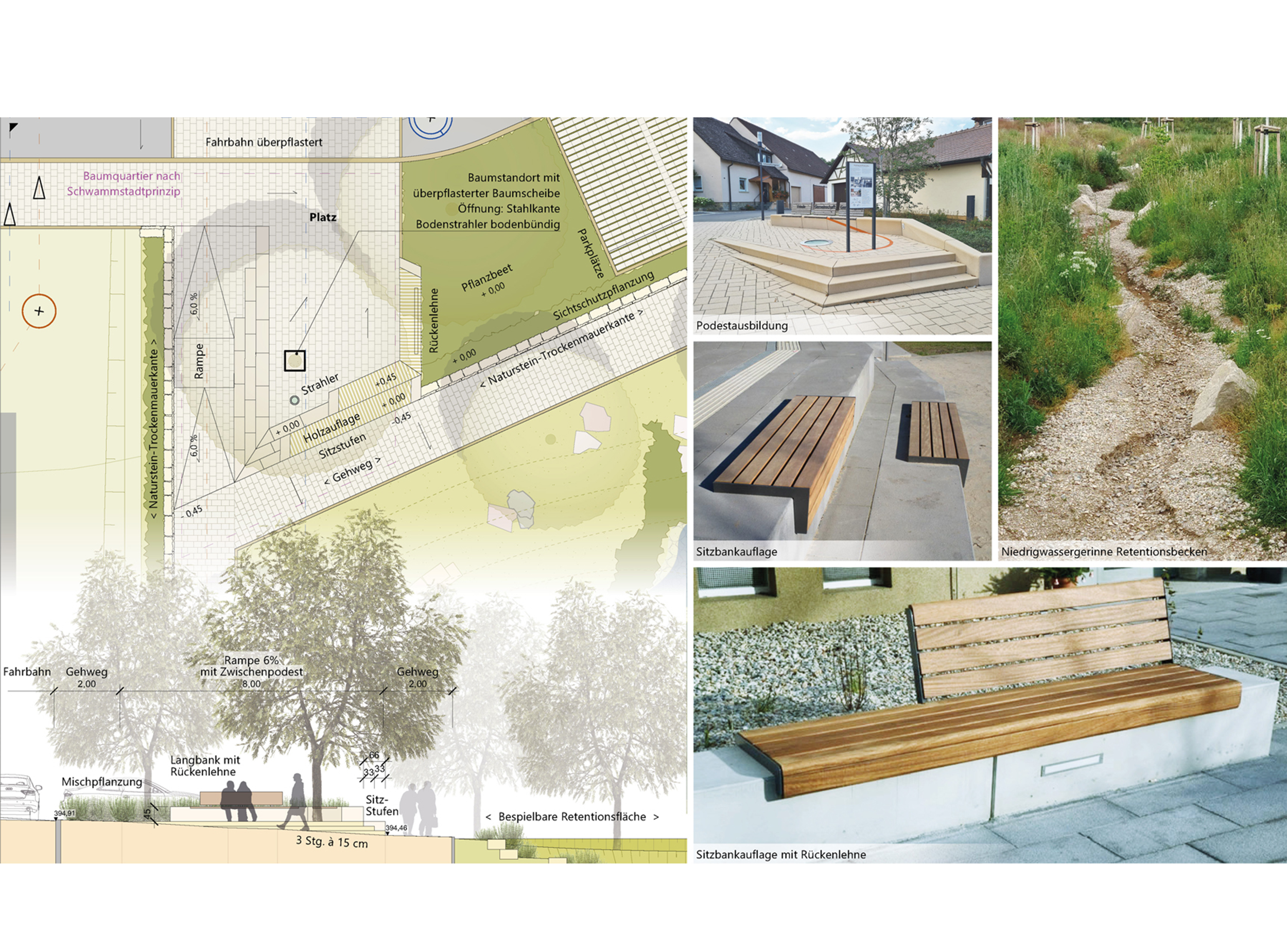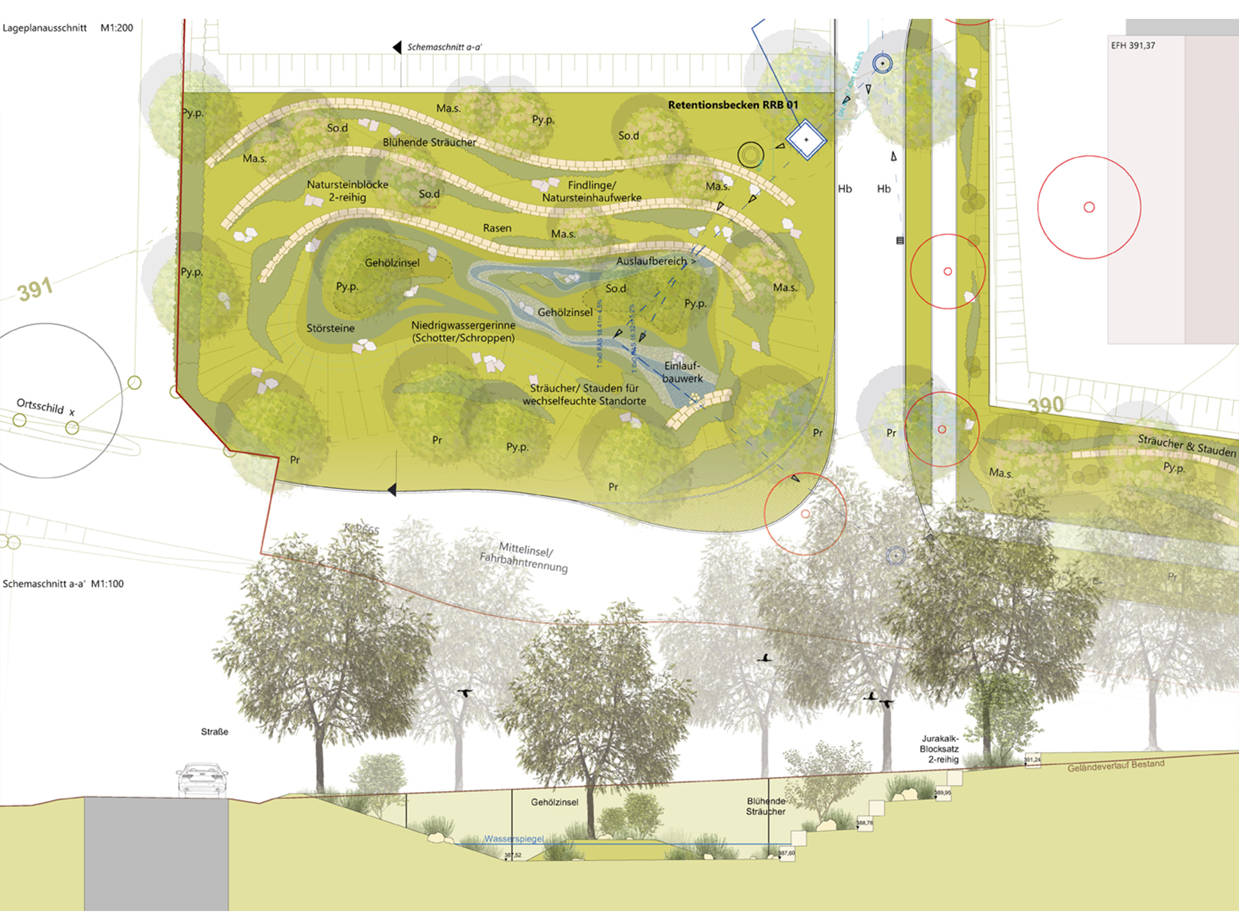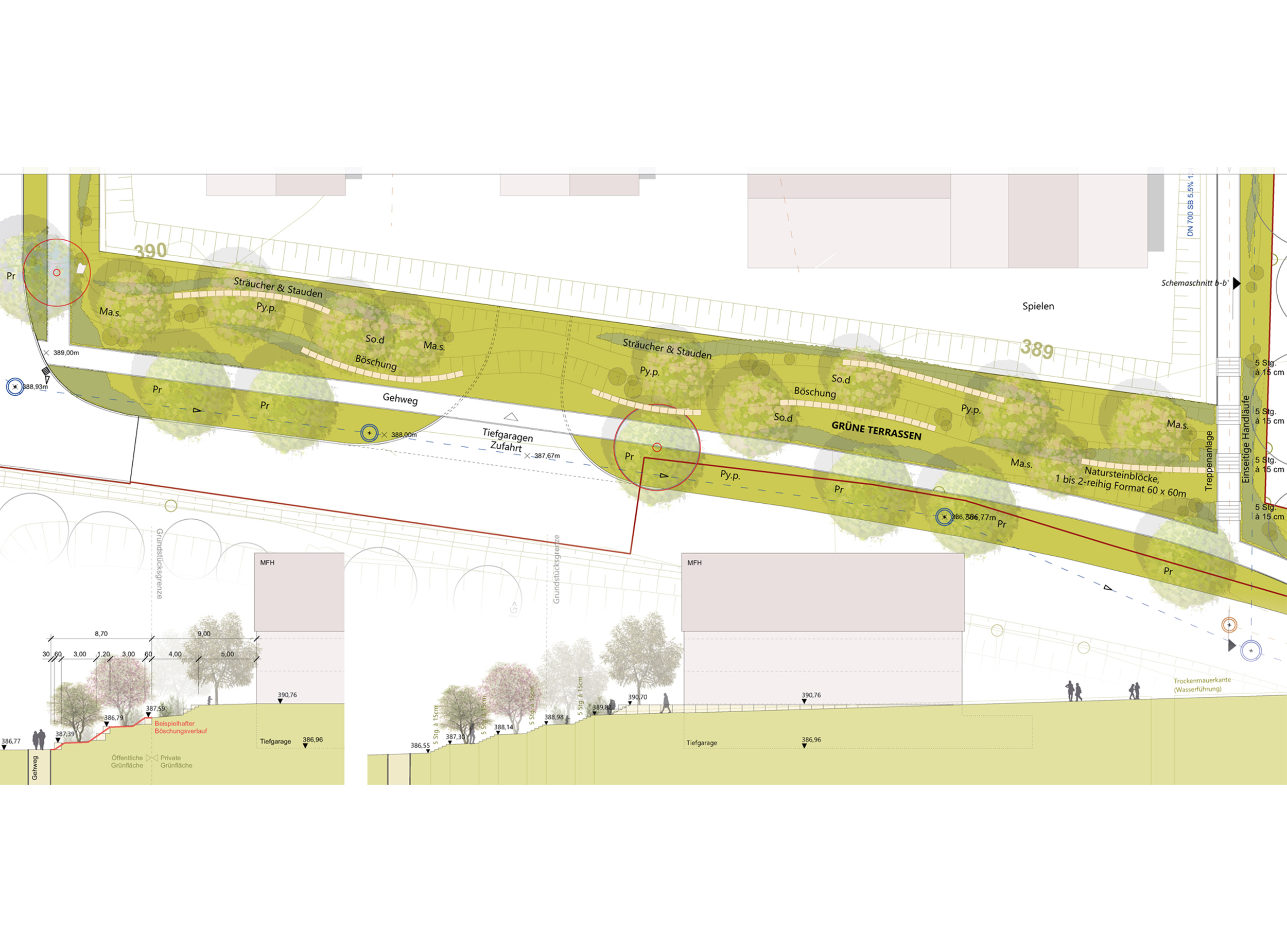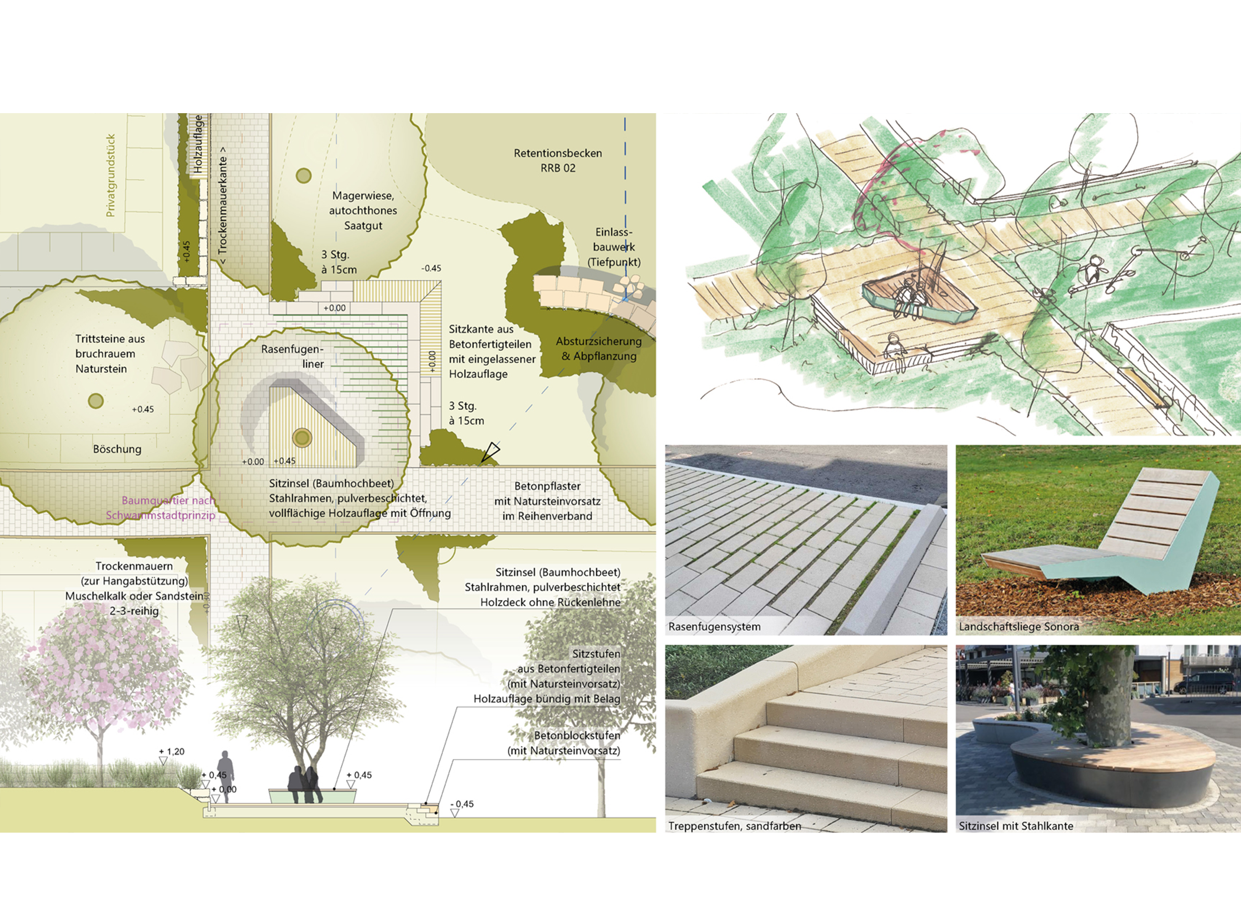 Die öffentlichen Grünflächen gliedern das Neubaugebiet in Form von „grünen Achsen“ und straßenbegleitenden Grünstreifen.