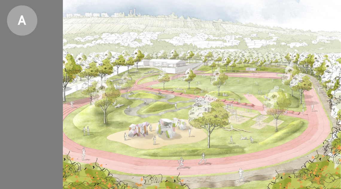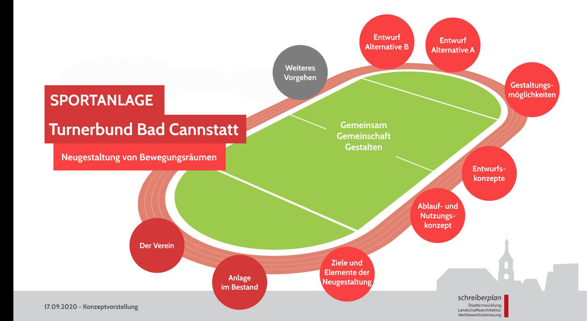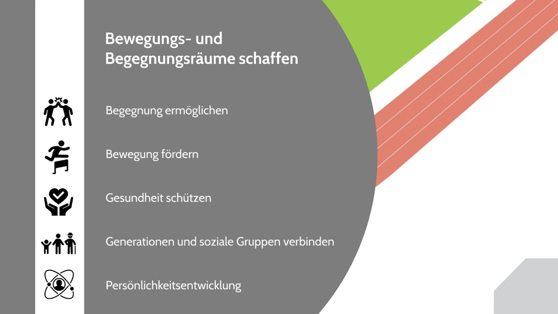 Sozial-gesellschaftliches Ziel der Neugestaltung und Grundgedanke der ersten Entwurfsvarianten ist die Gestaltung von Begegnungsräumen für unterschiedliche Bevölkerungsgruppen, die offen zugänglich sind (flexible Zeiten, nur teilweise „feste“ Belegung“, auch für Nicht-Vereinsmitglieder). Es soll ein attraktiver und offener Sportcampus mit einem Nebeneinander von verschiedenen Sport- und Bewegungsformen entstehen, der soziale Gruppen und Altersgruppen zusammenbringt.