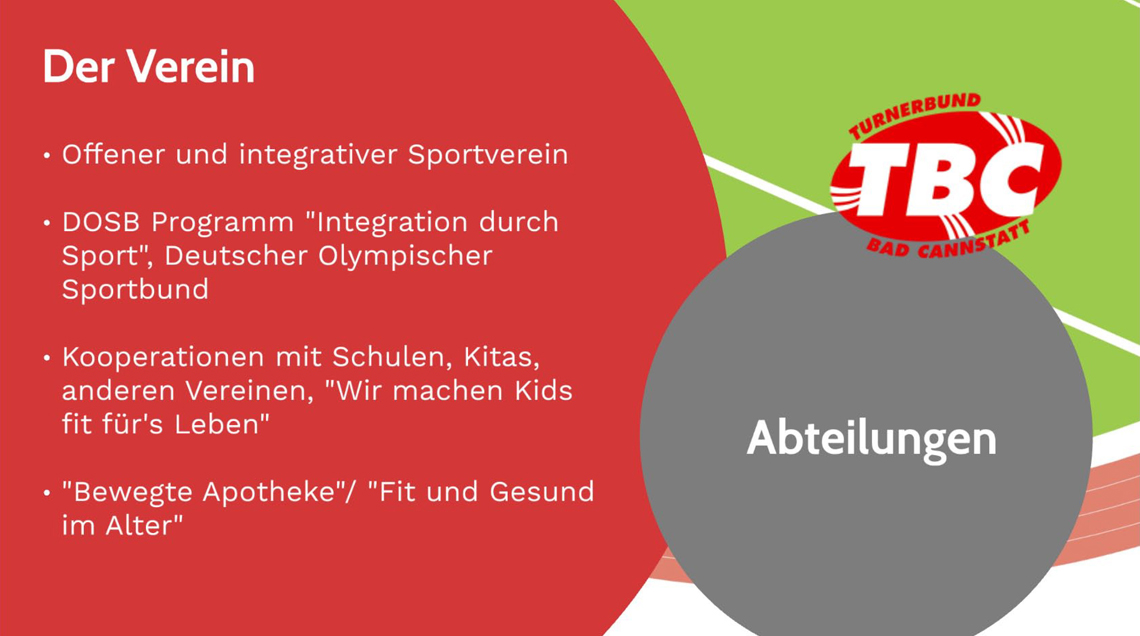 Der Turnerbund Bad Cannstatt (TBC) ist ein offener und integrativer Sportverein. Es gibt sowohl Abteilungen für den Leistungssport, aber auch zahlreiche für die Bewegungsförderung und Begegnung von Jung bis Alt.