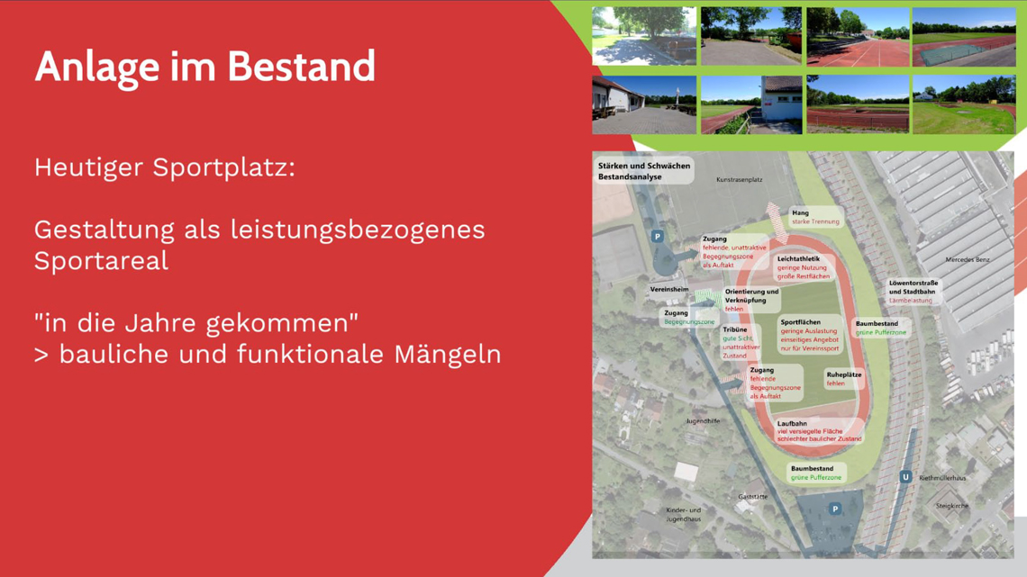 Das Sportstadion weist inzwischen jedoch sowohl funktionale, als auch bauliche Mängel auf, die durch eine einseitige Nutzbarkeit und Gestaltung begleitet werden.