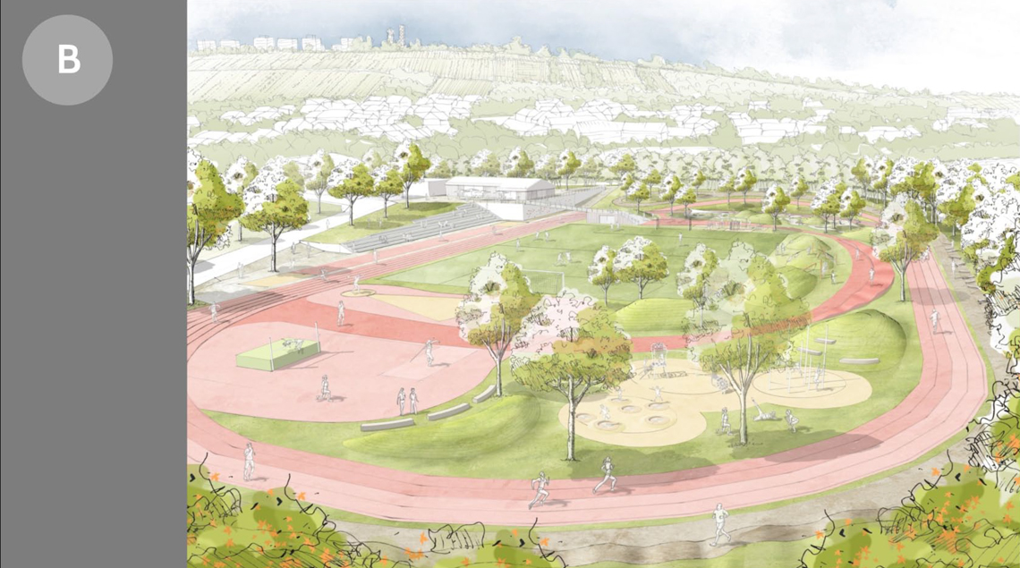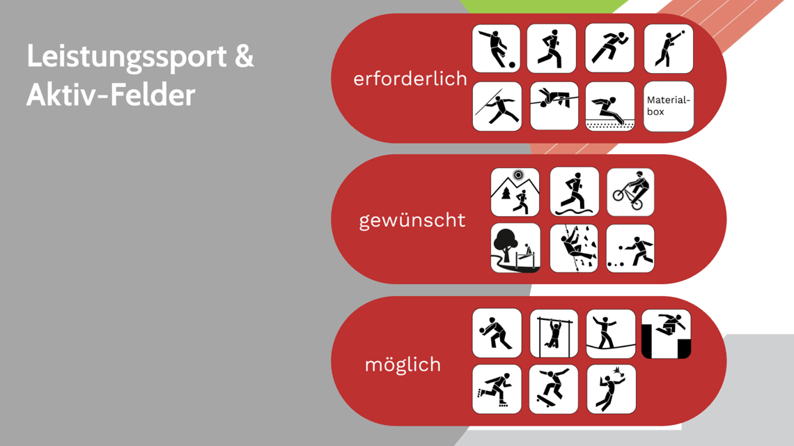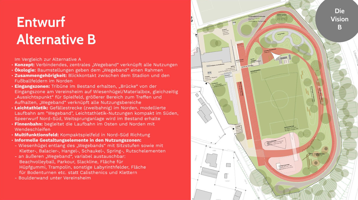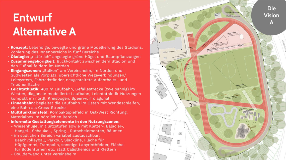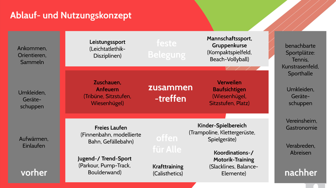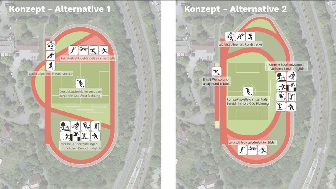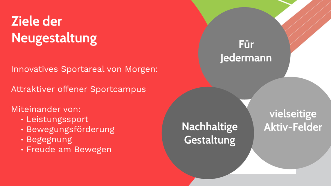 Bauliches Ziel der Neugestaltung des Sportareals ist aus diesem Grund einerseits die Elemente für den Leistungssport und v.a. für die Leichtathletikdisziplinen zu erneuern, aber andererseits durch die Neugestaltung auch neue Bewegungs-, Freizeitangebote und Spielbereiche zu ergänzen. Zudem können die funktionalen Defizite angegangen werden (z.B. erschwerte Orientierung und Auffindbarkeit der Zugänge, untergenutzte Flächen).