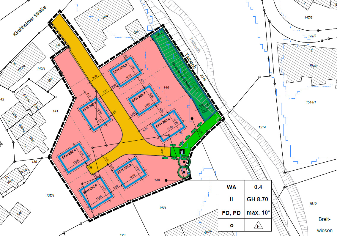 Entwicklung eines Baugebiets mit sieben Grundstücken im Ortskern der Gemeinde in direkter Nachbarschaft zum Talbach.