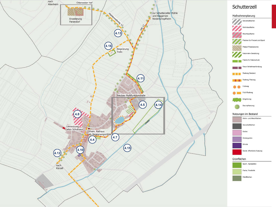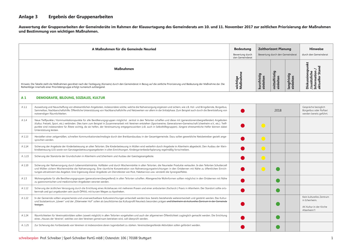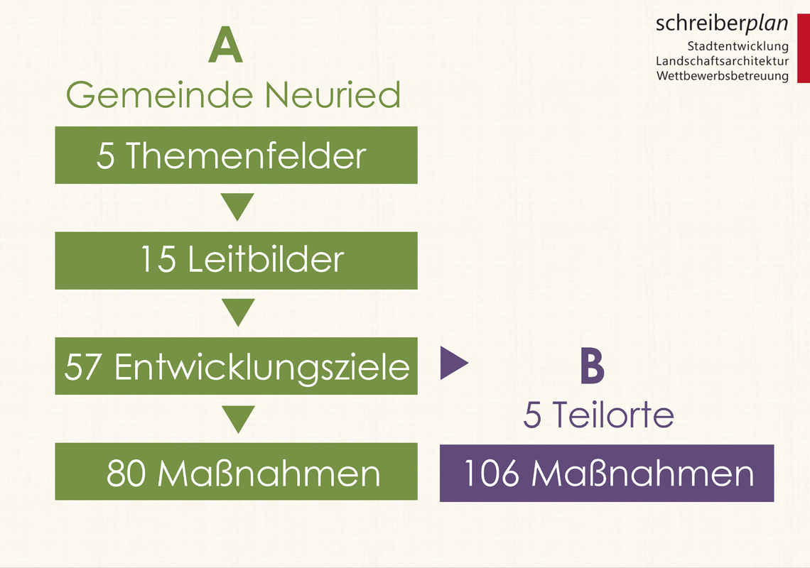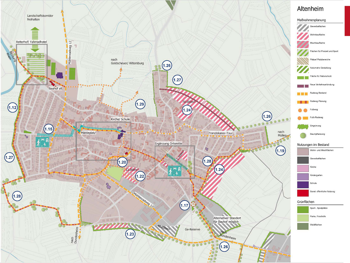 In enger Zusammenarbeit mit dem Gemeinderat und der Bürgerschaft wurden zu 5 Themenfelder 15 Leitbilder, 57 Entwicklungsziele mit 80 Maßnahmen für den Hauptort Altenheim und 106 Maßnahmen für die Teilorte entwickelt.