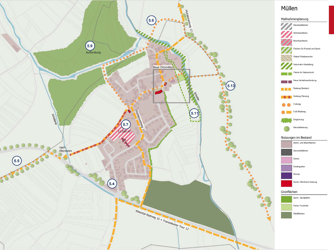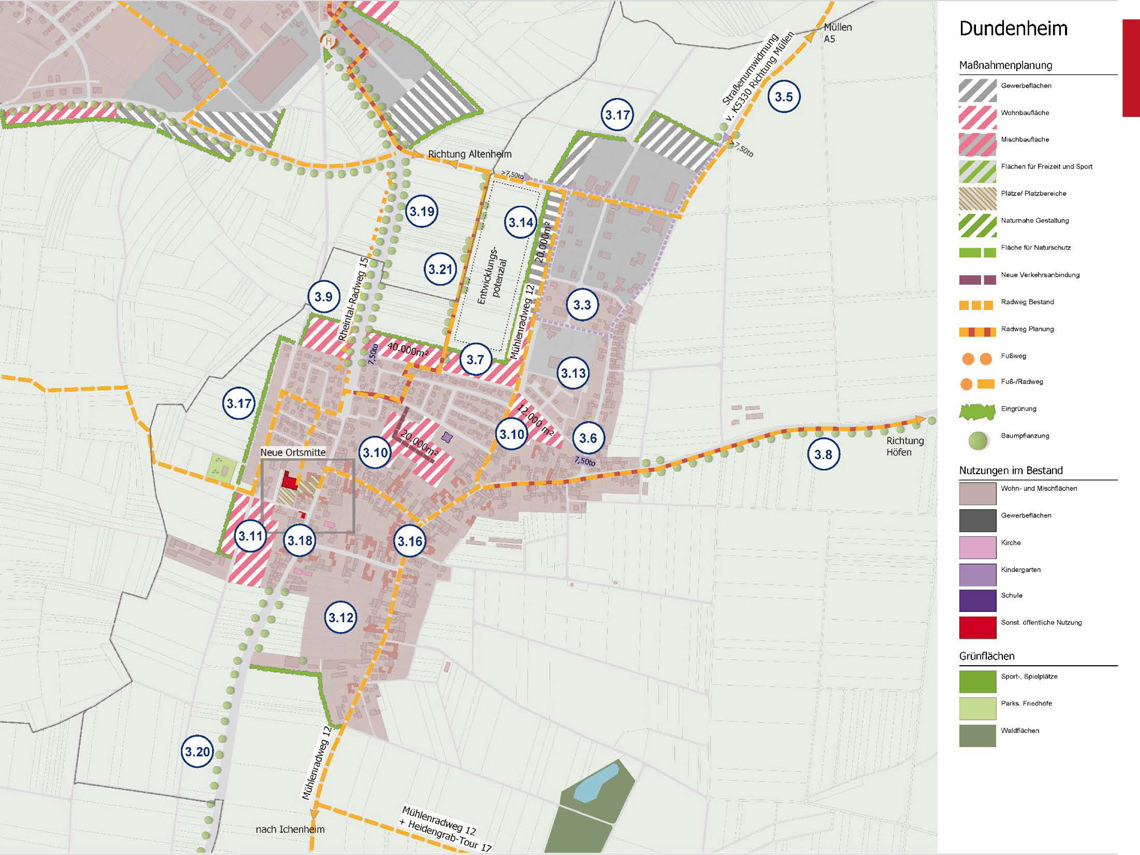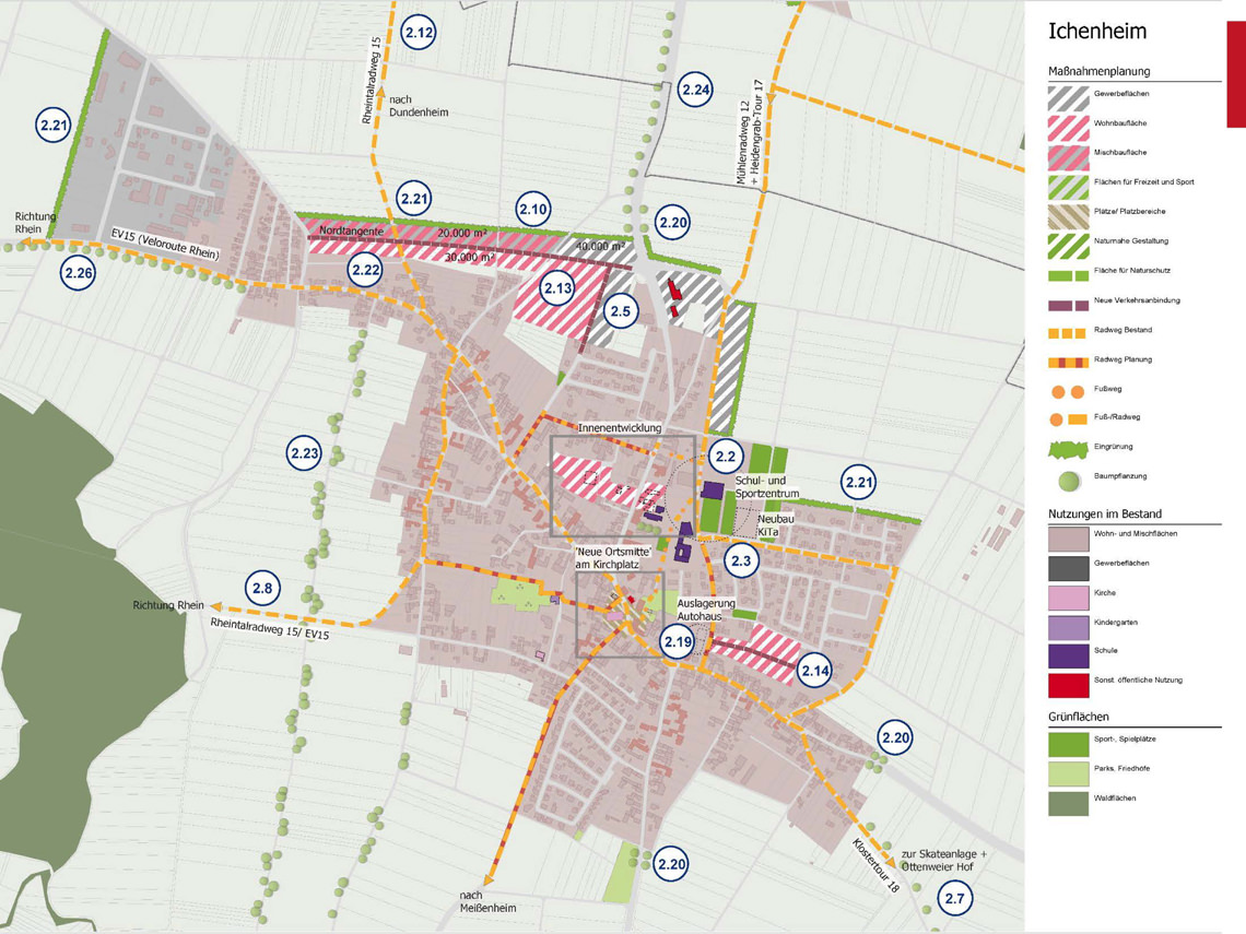 In enger Zusammenarbeit mit dem Gemeinderat und der Bürgerschaft wurden zu 5 Themenfelder 15 Leitbilder, 57 Entwicklungsziele mit 80 Maßnahmen für den Hauptort Altenheim und 106 Maßnahmen für die Teilorte entwickelt.