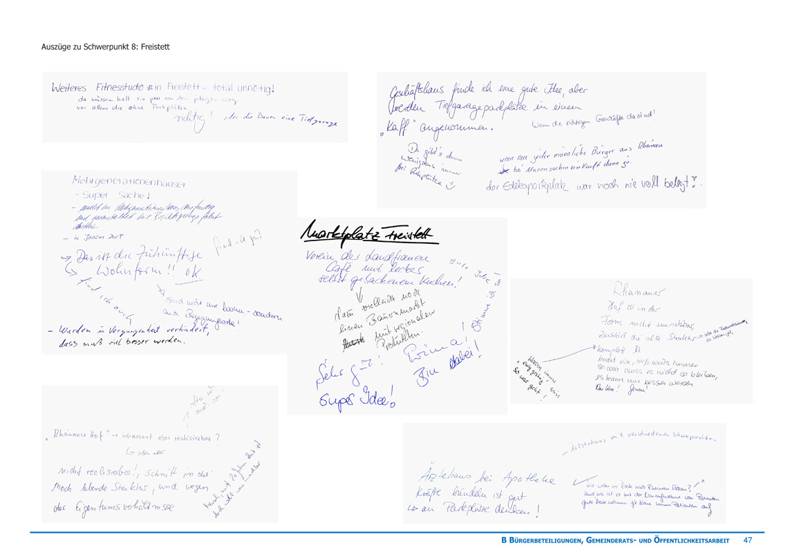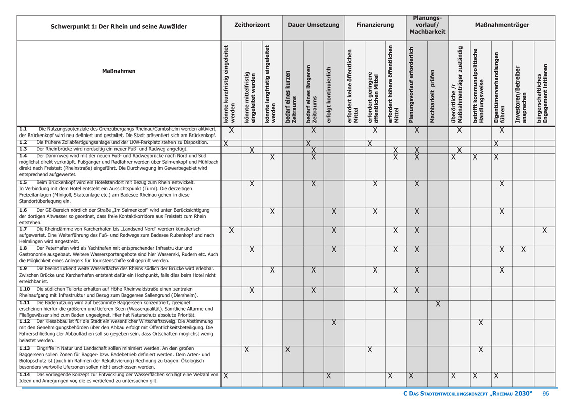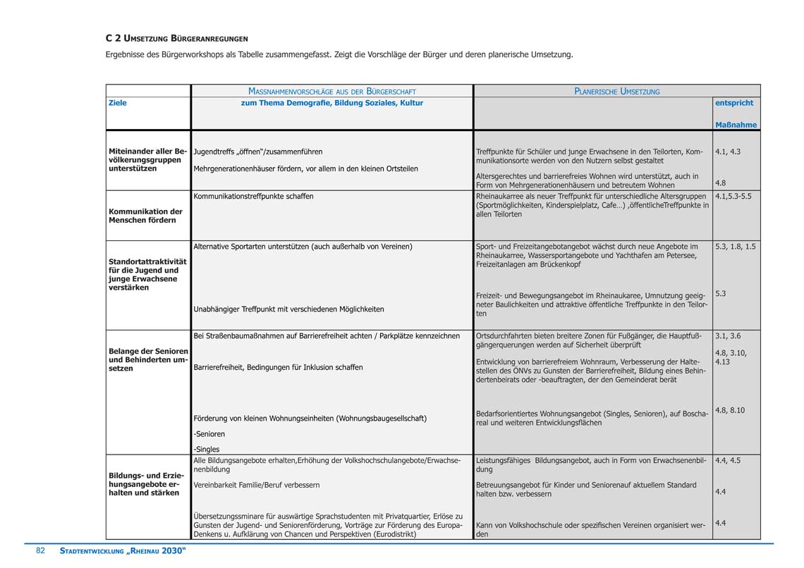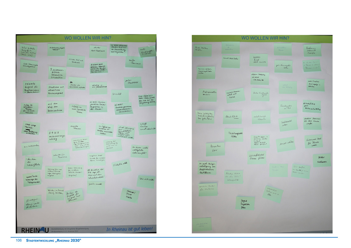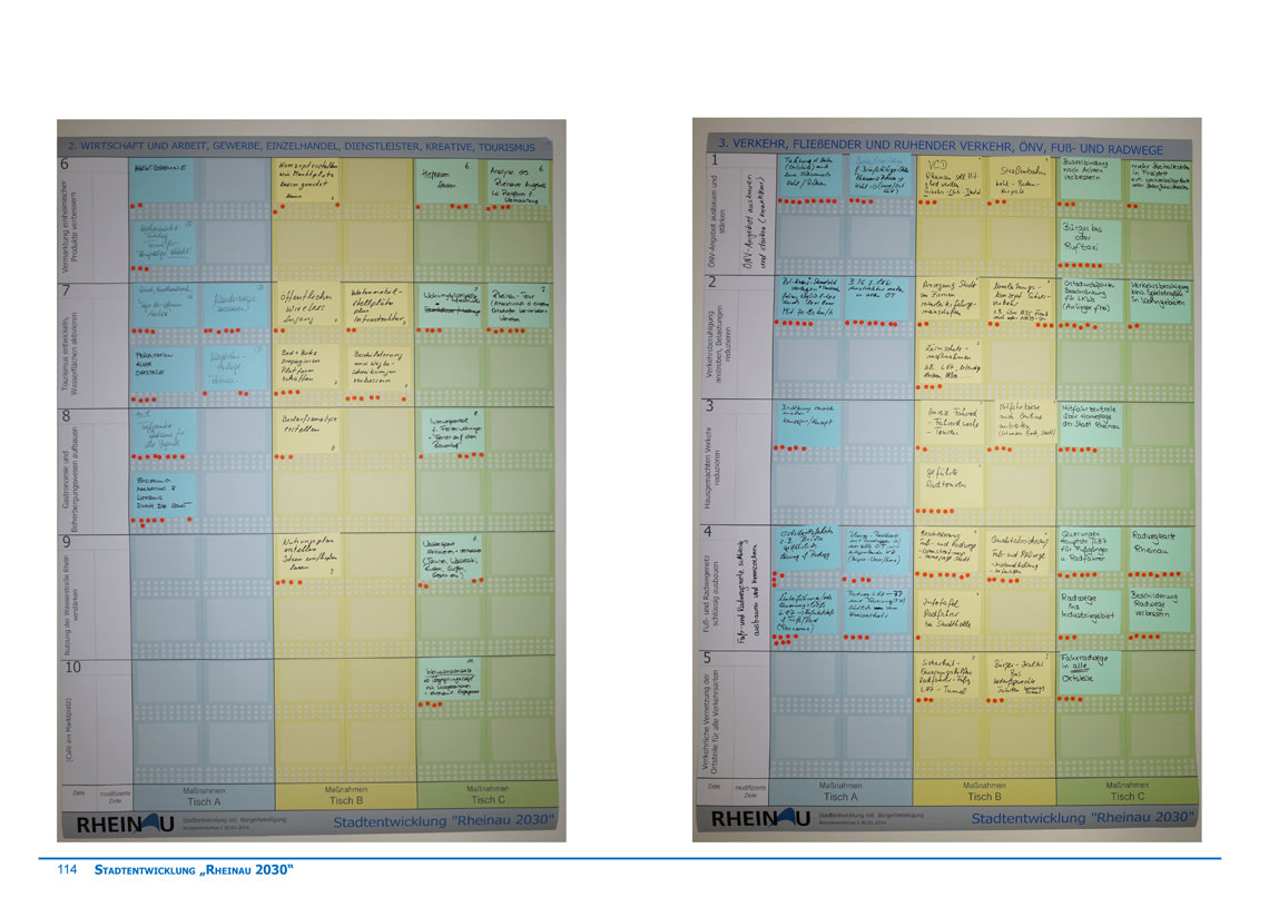 Inhalte der einzelnen Themen waren unter anderem die Verknüpfung der angrenzenden Ortschaften, die Verbesserung des Verkehrssystems, Wirtschaftliches und Soziales, Förderung von Bildung und Kultur, sowie der Umgang und die Vernetzung der Ortschaft mit der angrenzenden Rheinaue.