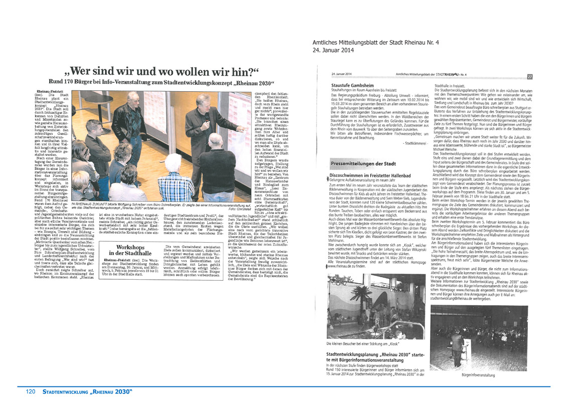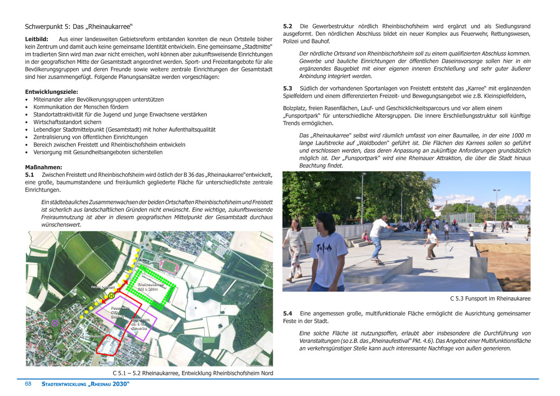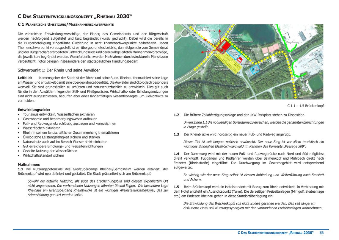 Gemeinsam mit dem Gemeinderat und den Bürgern der Stadt Rheinau wurden in intensiver Zusammenarbeit ein Stadtentwicklungskonzept erarbeitet, welches der Stadt Rheinau mit seinen acht erarbeiteten Leitbildern und den themenbezogenen Maßnahmenvorschläge als Leitfaden für die kommunale Stadtentwicklung bis ins Jahr 2030 dienen soll.