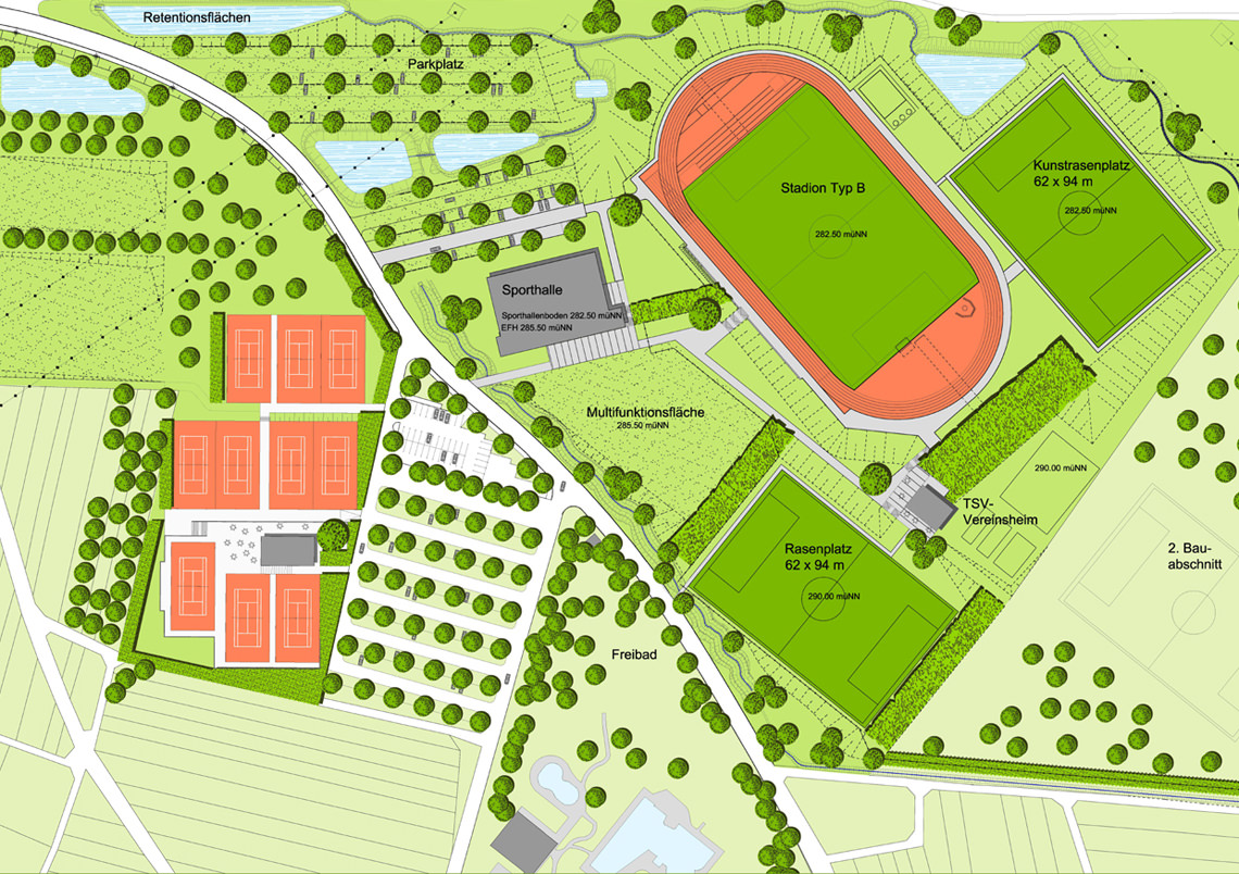 Das Büro Prechter+Schreiber GbR, heute schreiberplan GmbH, erarbeitete seinerzeit den städtebaulichen Entwurf, den Bebauungsplan sowie die Objektplanung Freianlagen/Sportanlagen des neuen Sportparks "Im Speck" der Stadt Wendlingen am Neckar.