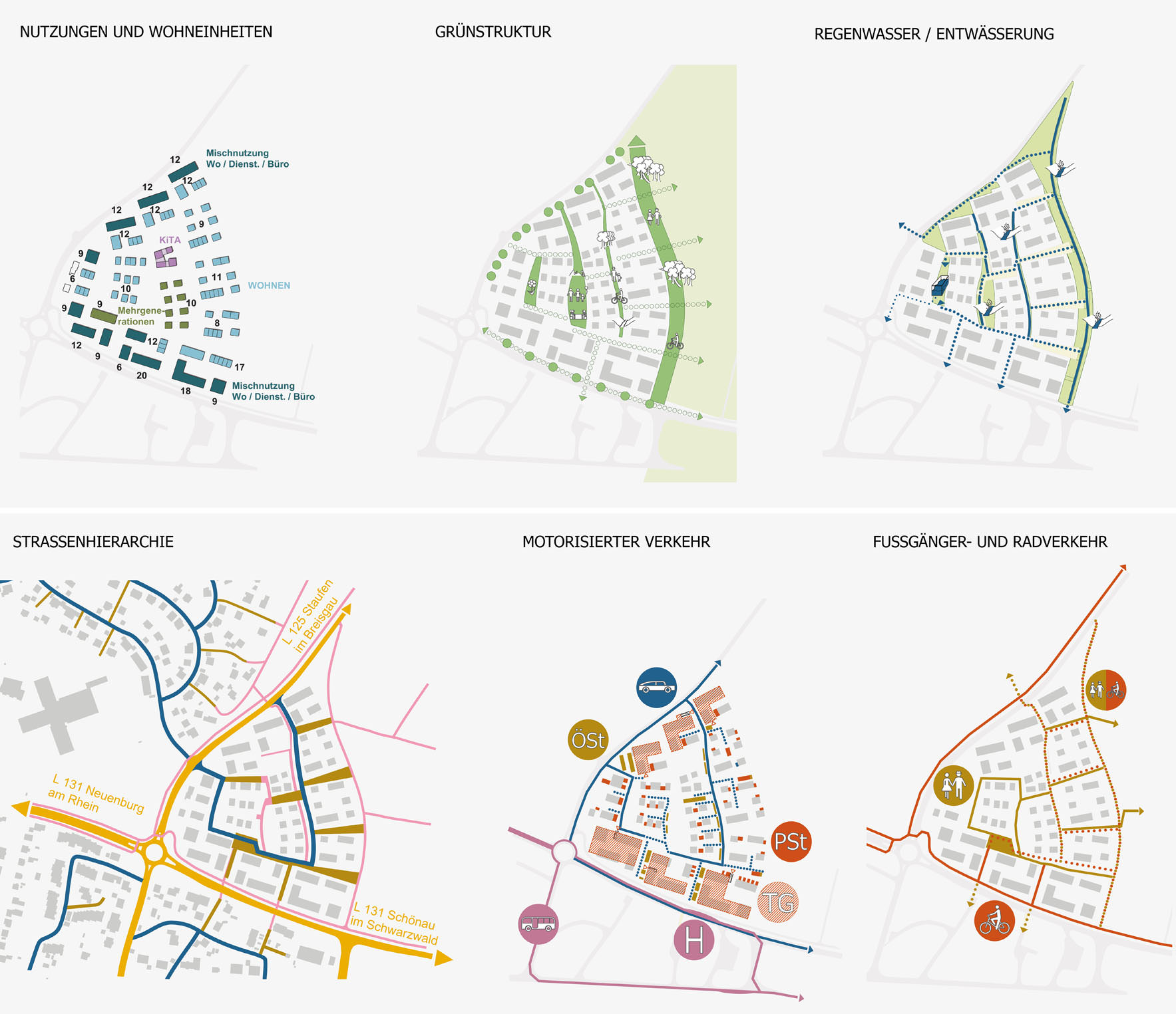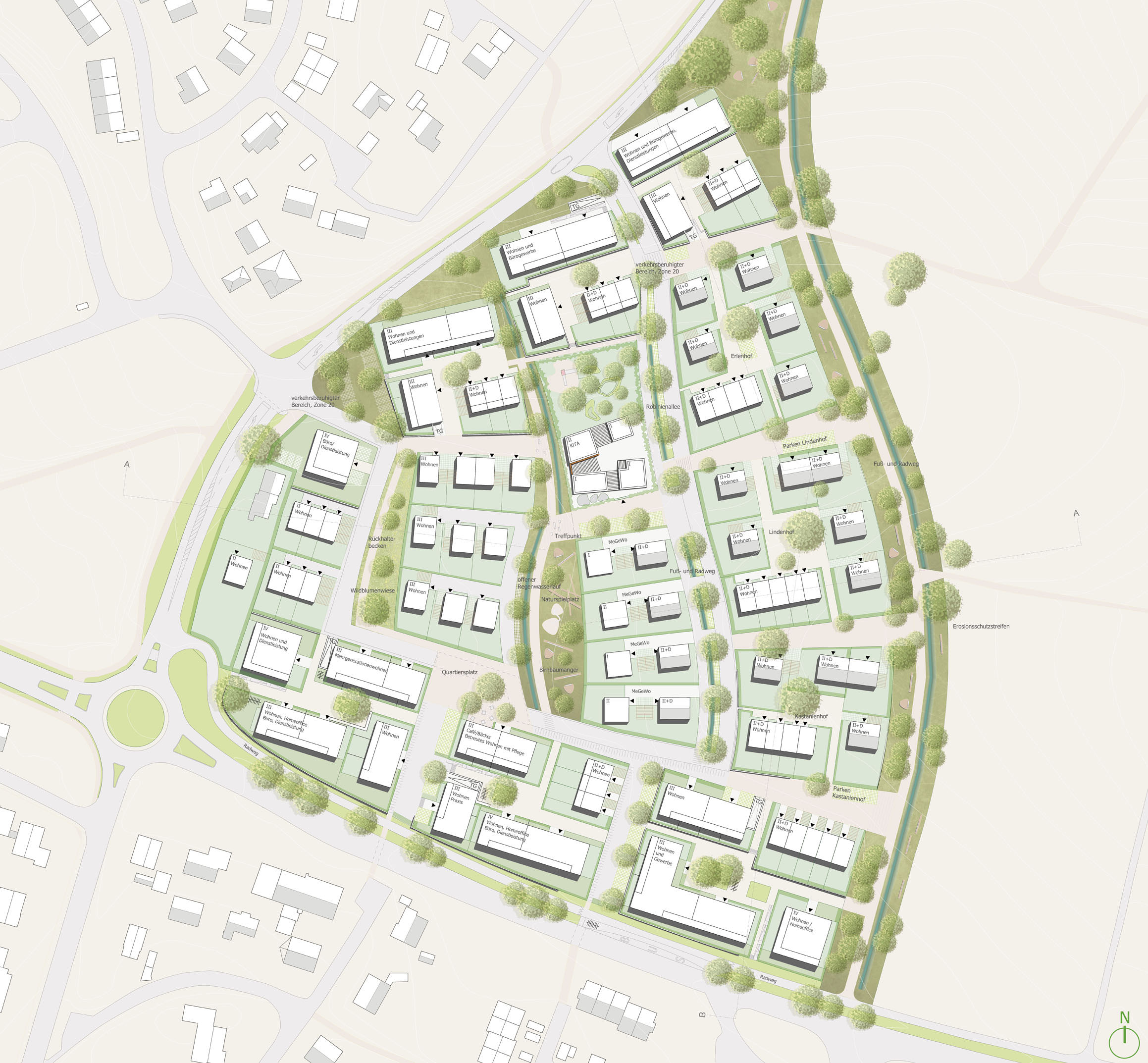 Die städtebauliche Grundfigur wird durch grüne Anger erzeugt, die sich von Nord nach Süd durch das Quartier „Am langen Rain“ schieben und jedem Wohnhof die Zuordnung an einen Anger ermöglichen.